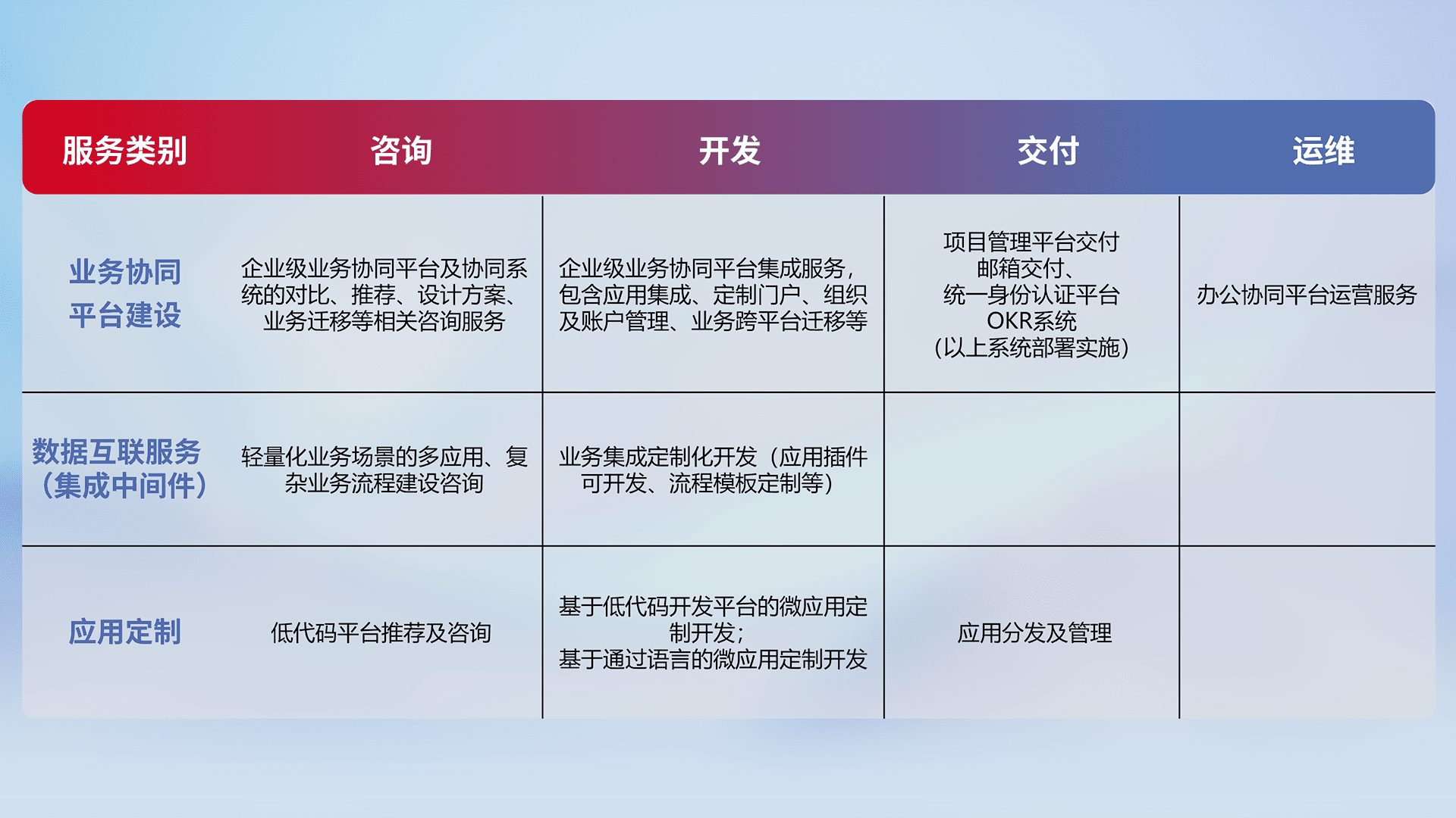 针对钉钉、、、、企微、、IDaas等平台级产品提供产品的规划、、方案、、、、交付、、定制化开发等服务,,实现如统一协同办公、、、、智能客户服务、、、混合会议管理、、智能数据查询、、、等业务场景,,,,实现数字化转型。。。。
